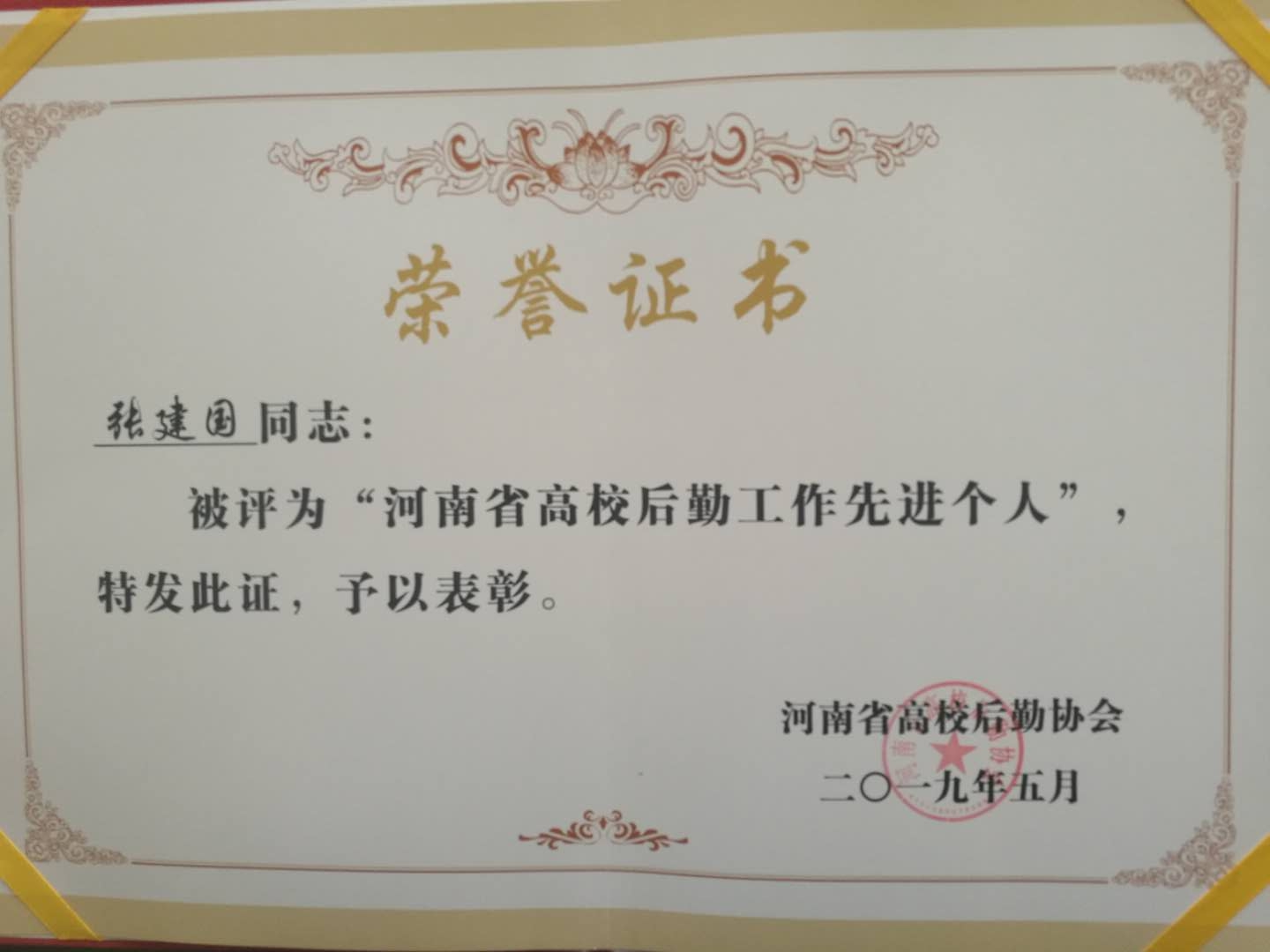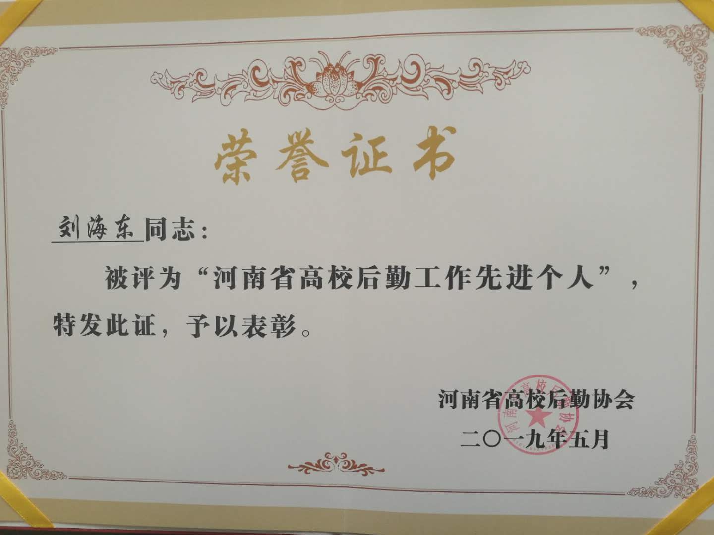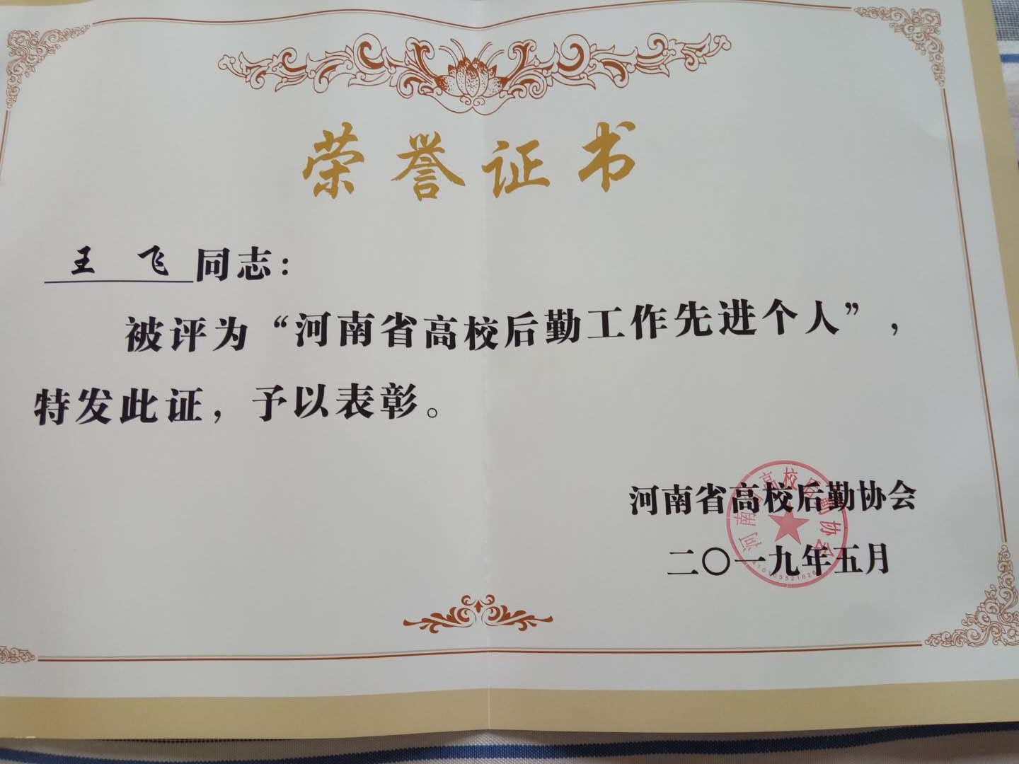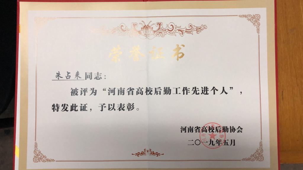 2019年5月17日,我校分管后勤工作的党委委员、副校长吴玉伦带队,后勤处处长张建国、副处长侯武军一行,到三门峡参加河南省教育厅组织的“双达标”推进会和河南省高校后勤协会2019年全体会员大会。会上,省教育厅领导对“双达标”工作做了重要部署,后勤协会会长柳娜做了工作报告。同时对河南省高校后勤工作先进集体和先进个人进行了表彰。我校后勤管理处张建国、王飞、朱占来、刘海东荣获“先进个人”荣誉称号。